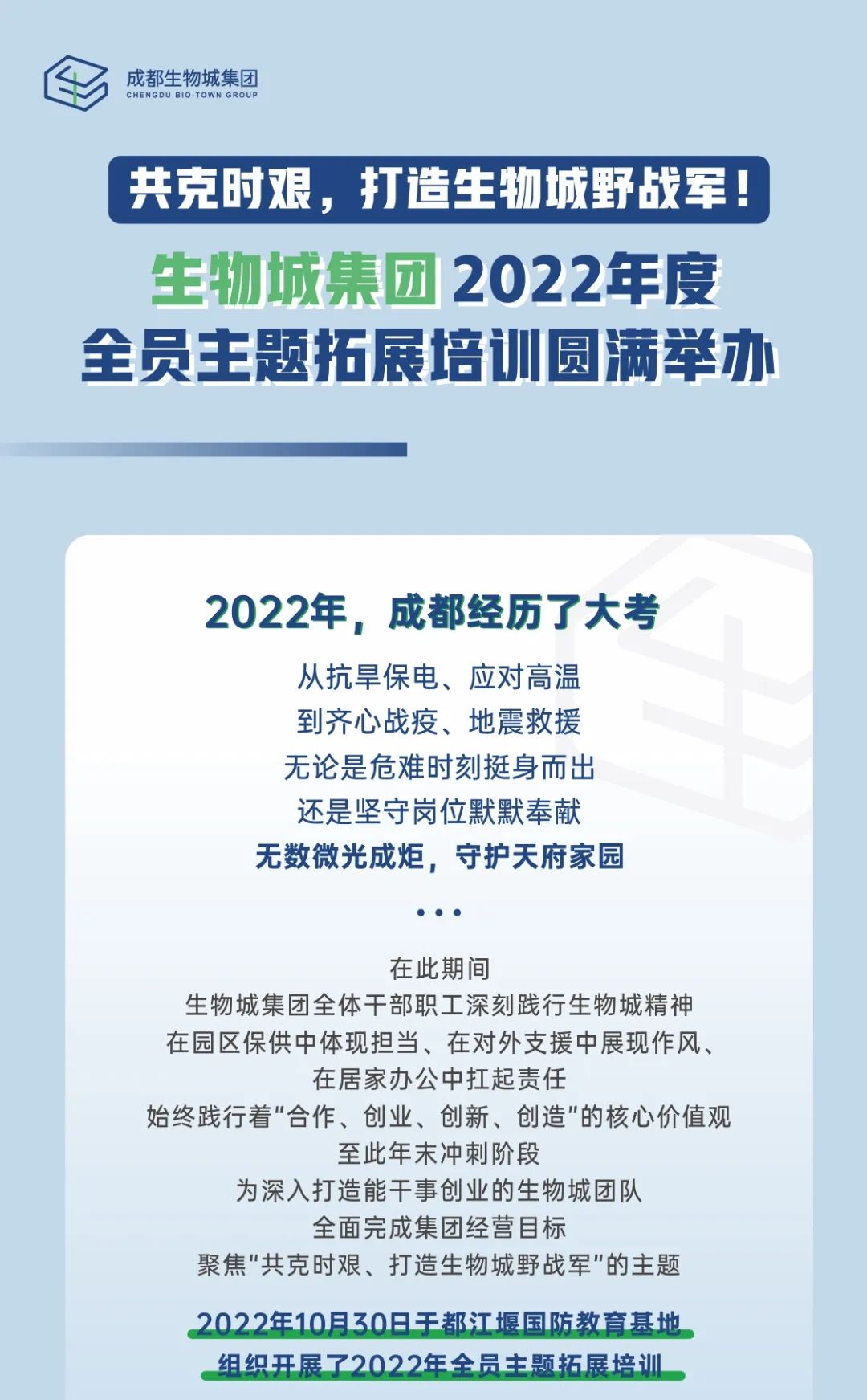 共克時(shí)艱,打造生物城野戰軍?。锍羌瘓F2022年度全員主題拓展培訓圓滿(mǎn)舉辦